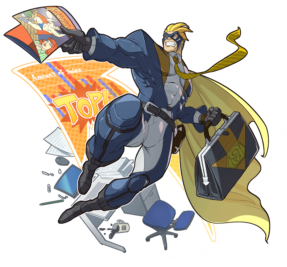 A corporate sales manager by day who becomes a hero of justice by night. Balancing his work and heroics makes him a very busy man. His iron fists can smash evildoers, and yet still manage maximum sales growth!